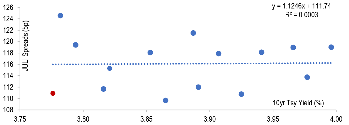 JULI spread to Treasuries (bp) 110 110 Still attractive yields, a continuation of positive returns, relatively lighter supply in the coming months and the start of Fed cuts will be supportive of spreads, while slower growth and a trend towards lower yields limits meaningful further spread tightening.