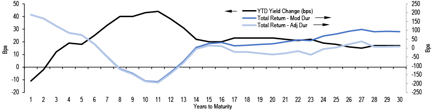 • Short Duration: RRP balances have stabilized around $300bn, with limited room to decrease further. Both domestic bank borrowing in the O/N unsecured market and US banks’ participation in the repo market remain minimal, suggesting reserves have not transitioned from abundant to ample yet