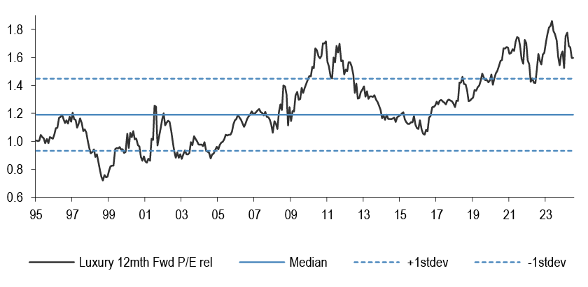 Luxury stocks still trade outright expensive relative to the market.