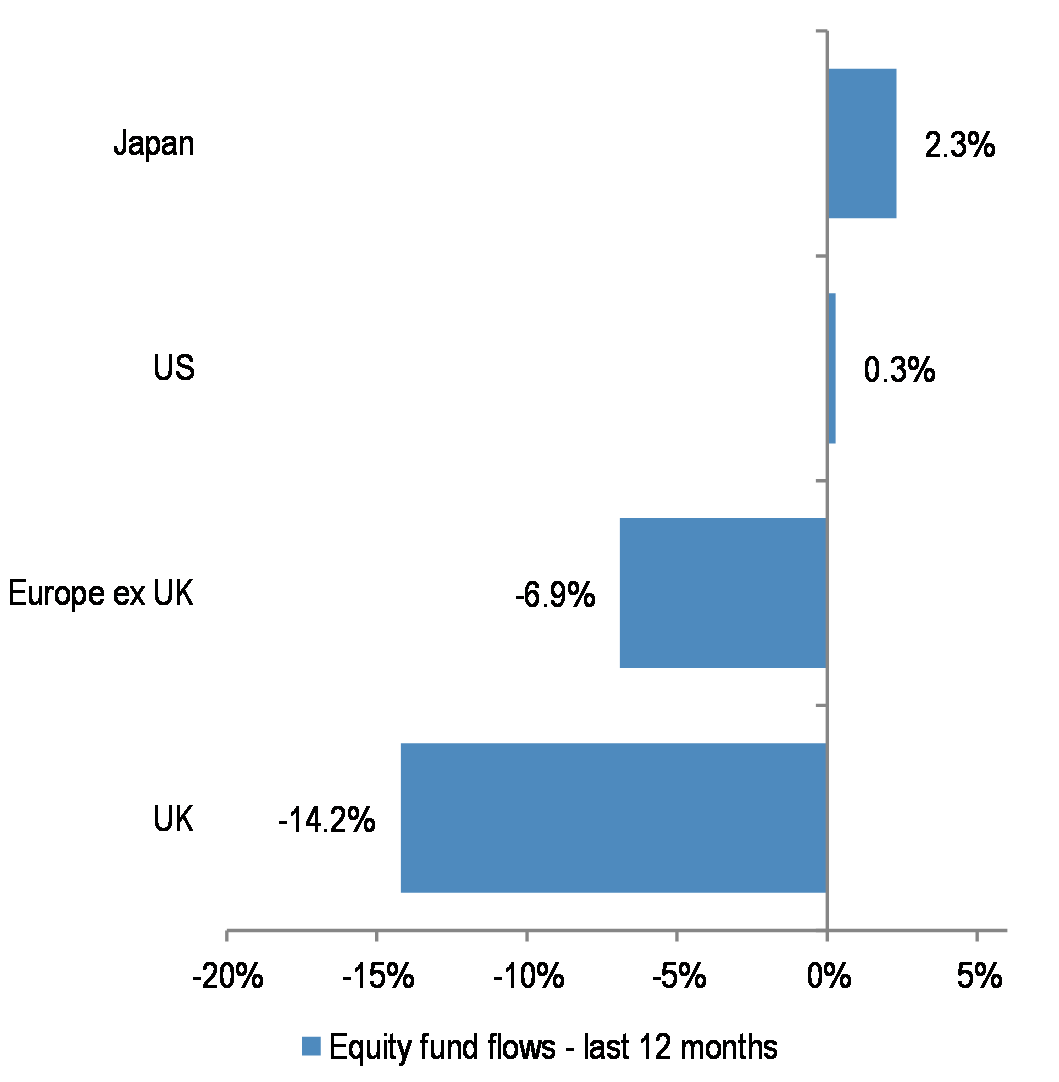 - Finally, Banks remain much more levered than any other sector, and are a beta play on overall activity. Banks could suffer if economies enter contraction, and if some of the very benign credit backdrop changes next year, with spreads widening and delinquencies rising. Regionally, we maintain our preference for Japanese over US and European banks. We are using the funds to upgrade Healthcare, from Neutral to OW. The sector has lagged this year, but could benefit from high USD exposure, low beta and the long duration angle.