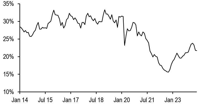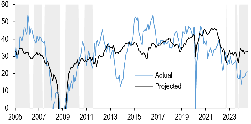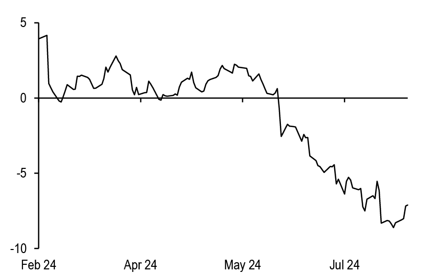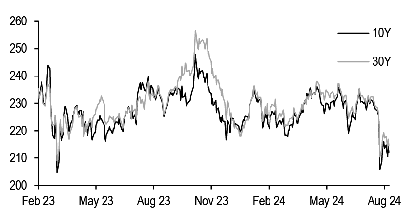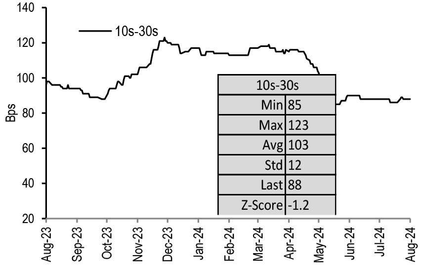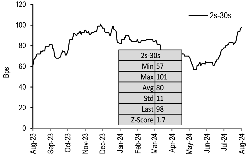 Against the backdrop of easing inflation pressures and above-trend growth, the real Fed funds rate is decidedly more restrictive than before prior easing cycles and it is notable that Fed speakers from across the spectrum have recently highlighted the need to moderate this stance ( Figure 2). Thus, with the disinflationary process resuming and labor markets significantly looser than they were a year ago, we think this makes the case for substantial Fed easing in the coming months, and we continue to project 50bp cuts in September and November before downshifting to 25bp through late-2025. However, markets have clearly moved in the opposite direction this week, pricing in just 30bp of easing by the September FOMC meeting, and 94bp for 2024. It’s tempting to add duration here, with markets pricing a slower and shallower path of cuts than our modal view, but we prefer to be patient, knowing that position technicals could be a drag over the near term. Specifically, our Treasury Client Survey index has extended significantly over the last few weeks to the longest levels since December. Should the conditions present themselves, we would look to add duration in the 3- to 5-year sector of the curve. Meanwhile, we maintain our 5s/30s steepener position as a lower-beta duration long with a better carry profile which is both supported by historical steepening pattern into Fed easing cycles and reinforced by higher term premium (see Treasuries).