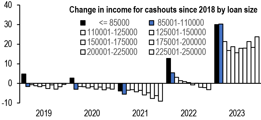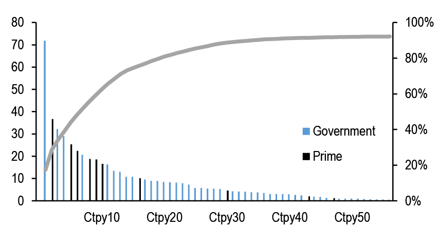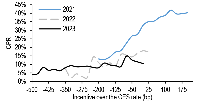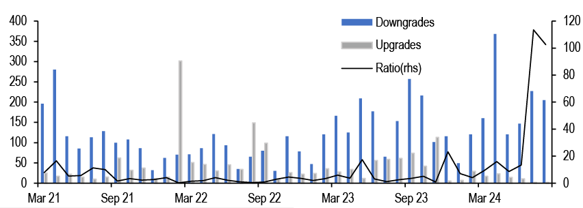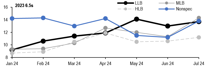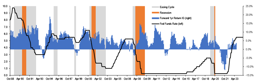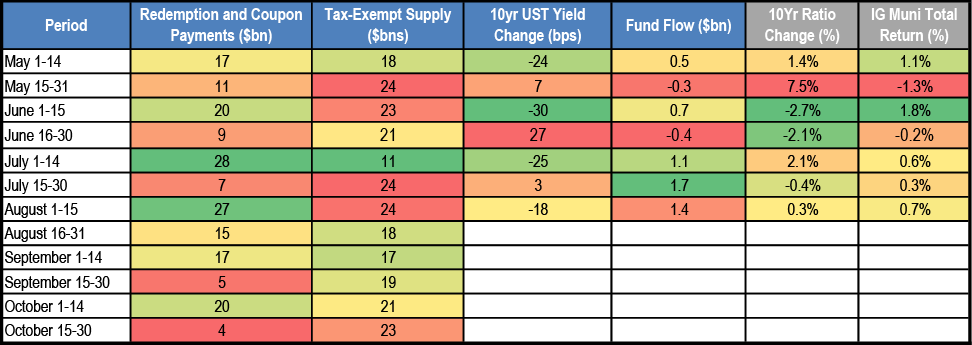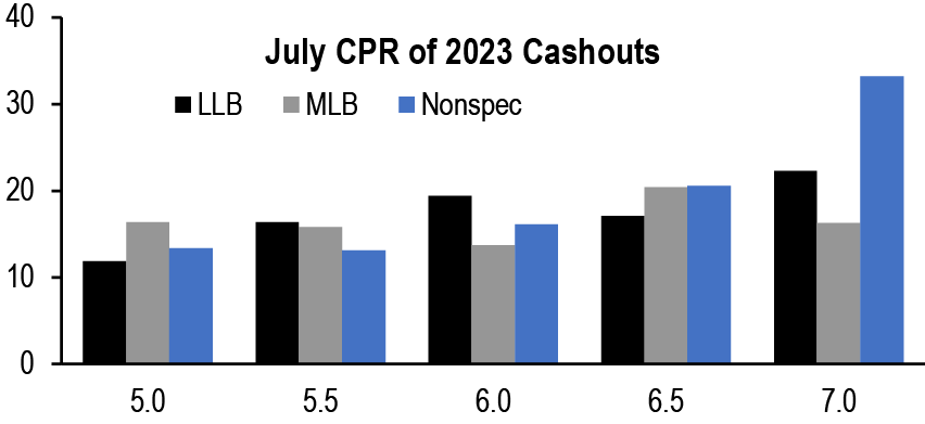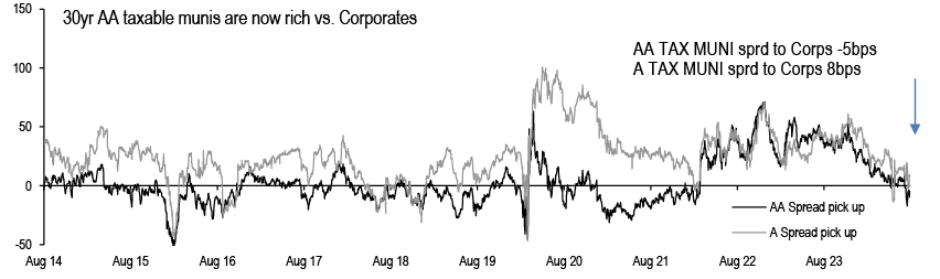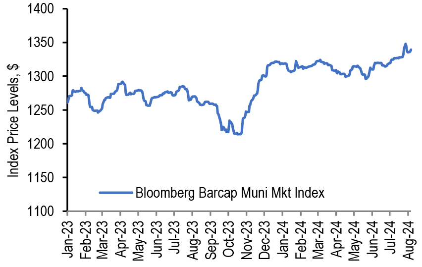 • Securitized Products: Higher coupons outperformed lower coupons, reflecting shifting demand and relative value up the stack. We prefer UIC conventionals and are underweight 4.5s and 5s. We think mortgage rates can fall to 6% by year-end, but this will have a limited impact on house prices. In CMBS, we think upper IG mezz bonds look cheap to similar duration single-A corporates