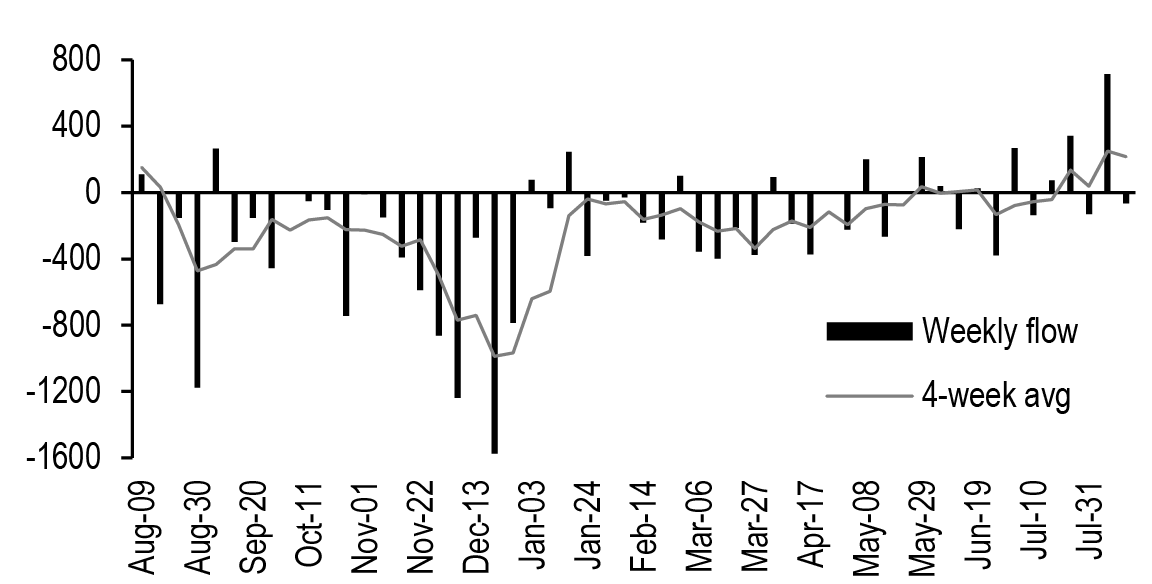 In EM fixed income, we are MW GBI-EM local rates, CEMBI and EMBIGD. EM bond flows were -$1.4bn (-0.36% of weekly AUM, down from -$1.0bn).