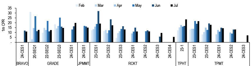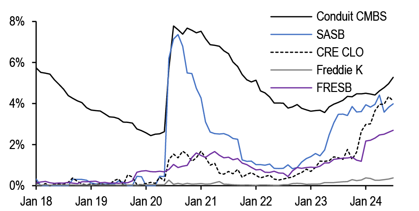 Continue to prefer UIC conventionals. The July remit data show that serious delinquency rate for private label CMBS increased to 4.74% and we continue to see elevated levels of DLQ buyouts and loan modifications in the CRE CLO market.