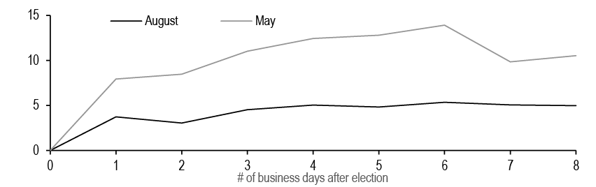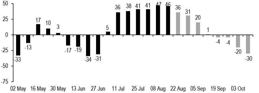 • Treasuries: Markets are pricing in a less dovish path than our forecast, but we remain patient before adding duration given long investor positioning. Jackson Hole speeches have not traditionally led to large yield moves, except in 2020 and 2022; we do not expect clear guidance from Chair Powell next week. We contrast the upcoming easing cycle with other easing cycles: policy is more restrictive than at any point in the last 30 years, pointing toward a deeper easing cycle, but financial conditions are easy and financial stress is low, making the case for a slower pace of cuts. Hold 5s/30s steepeners as a low-beta long with a better carry profile ahead of the first cut.