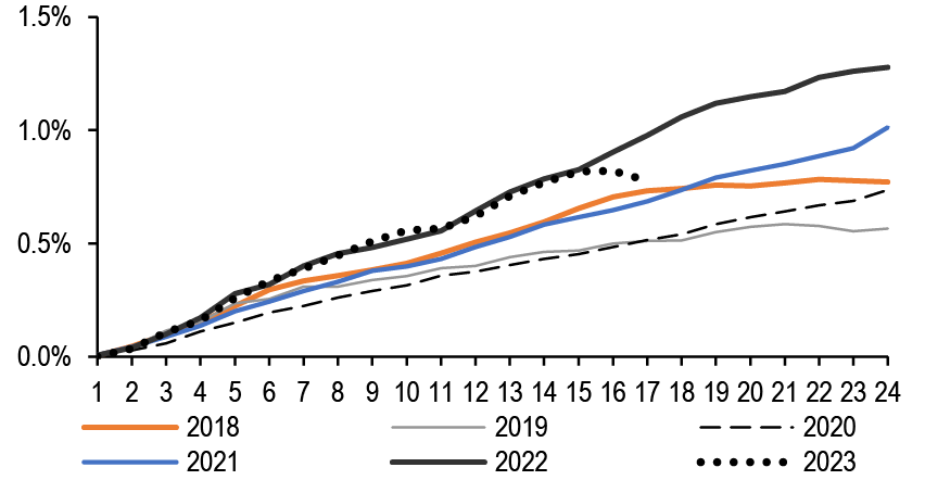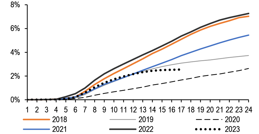 US CLO Primary AAA (Tier 1, bp) 135 SOFR + 150 We widened our base case CLO T1 AAA new issue spread forecast to 150bp (from 130bp prior) and introduced a 175-200bp risk case in the event of a hard landing.