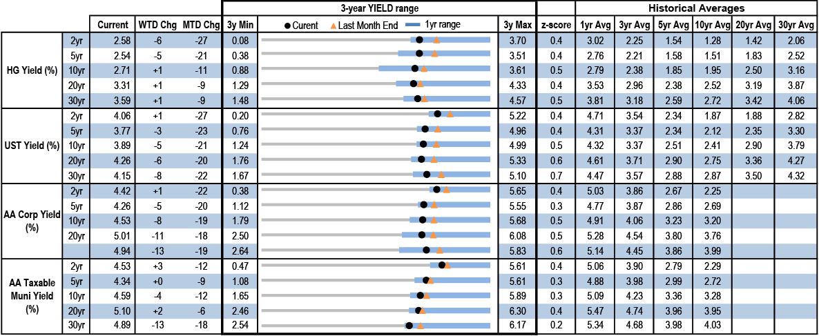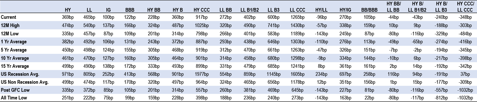 JULI spread to Treasuries (bp) 111 110 HG spreads recovered from the sell-off and are back close to our YE target. Expecting a grind tighter into month-end so long as yields remain rangebound.