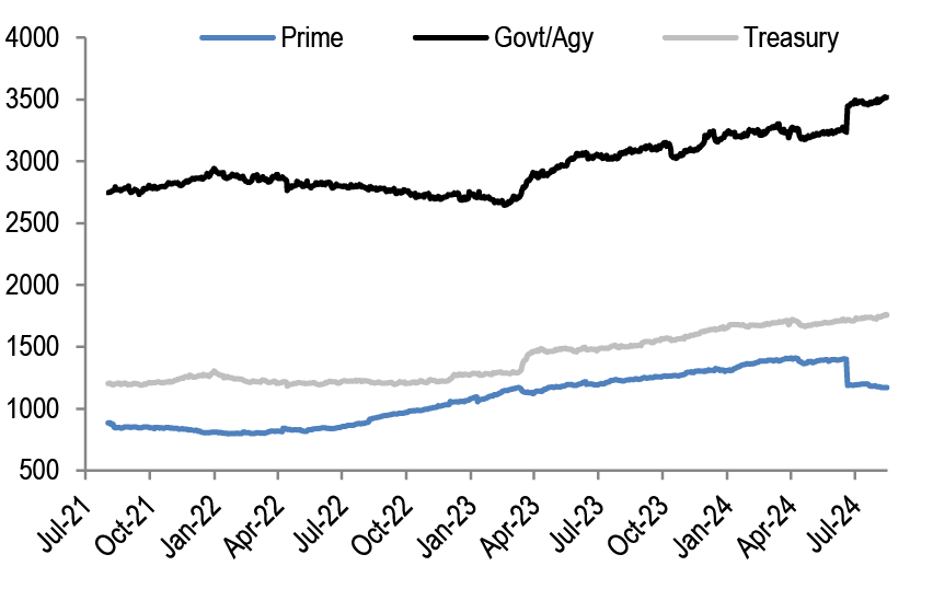 • Short Duration: RRP balances have trended lower, reaching $330bn on 8/16, and positive T-bill issuance over the past couple weeks has likely contributed to this trend. That said, we may be reaching a floor as net T-bill issuance stalls in early-September and as MMFs keep some amount of exposure meet liquidity needs. We expect RRP balances to hover near low to mid-$300bn range for the remainder of the month