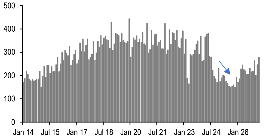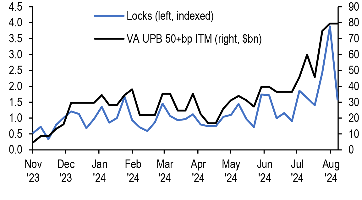 In the wake of the July employment report, Treasury yields initially plunged and corporate spreads widened before retracing these moves over the fortnight supported by the relative strength in the data and a normalization in risk sentiment ( Figure 1). Market liquidity conditions have also largely rebounded amid the decline in volatility. While limited, the data over the past two weeks has assuaged the worst fears surrounding an impending slowdown. The July CPI report delivered on expectations, as the core index rose 0.165% m/m last month to leave the year-ago rate to cool to 3.2% with most categories outside shelter flagging as soft, and we are currently tracking core PCE increased 0.122% in July (see US: Cooler July CPI, as expected, Michael Hanson, 8/14/24). Meanwhile the July retail sales report beat expectations, with the total index rising 1.0% m/m and the control group moving up by 0.3%, and strong consumer spending to start 3Q24 presents upside risk to our GDP tracking (see US: July retail sales suggest no slowing in 3Q real spending, Abiel Reinhart, 8/15/24). Most notably, initial jobless claims moved down from a peak 250k at the end of July to 227k, suggesting that after adjusting for one-off shocks emanating from recent weather events and auto-plant shutdowns, the level of claims are not significantly higher than in recent summers (see US: Jobless claims moved down, Murat Tasci, 8/15/24). As we look ahead, all eyes will be focused on initial claims next week, as it will overlap with the employment survey reference week, and we expect claims to remain roughly stable around 230k (see Economics). We also look forward to Powell’s comments at Jackson Hole, though it is unlikely the Chair will offer too much granularity on the magnitude or pace of easing given the importance of the upcoming August employment report.