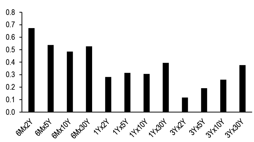 While it is highly likely the Fed will deliver a cut next month, the magnitude and subsequent pace of easing still remain highly uncertain and this leaves markets in a state of limbo as there is likely to be little clarity provided over the near-term. Indeed implied probability density functions inferred from call and put premia on Z4 SOFR futures indicate comparable weights between both shallow-cut and deep cut scenarios, leaving policy uncertainty elevated ( Figure 3). Against this backdrop high jump risk combined with more frequent jump days is manifesting in high delivered volatility and we think implieds look cheap considering these factors. Thus we maintain our long volatility bias and continue to express this in 5-year tails. We also maintain our swap spread curve flattening bias, as normalization in repo rates should bias front-end spreads wider whereas ongoing QT and elevated duration supply in Treasury markets should bias the long-end narrower. We like expressing this theme through a 3s/7s maturity matched swap spread curve flattener, which additionally is near the steep end of its one year range (see Interest Rate Derivatives).