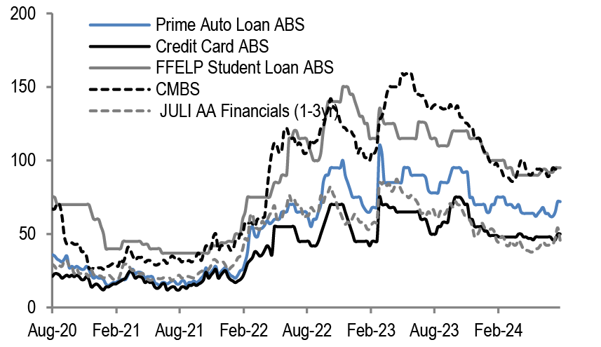 Turning to inflation markets, TIPS breakevens lagged the recovery in other markets and remain cheap versus our fair value estimates. With the Fed likely to begin cutting rates next month, we note that breakevens have not exhibited a consistent performance around the start of prior easing cycles. However, a Fed that is cutting due to risks coming into better balance and a desire to return policy rates quickly to neutral should be more supportive for breakevens than a Fed that is behind the curve. Meanwhile, technicals have turned more supportive as well. Demand for TIPS-focused funds has picked up alongside the decline in real yields and improvement in realized TIPS returns, driving the 4-week moving average of inflows to its highest level in more than 2 years. Along the curve, the intermediate sector offers value, and we prefer to express longs in inflation swaps rather than breakevens, given that IOTAs remain tight. Thus, we recommend tactical longs in 5Yx5Y inflation swaps (see TIPS).
