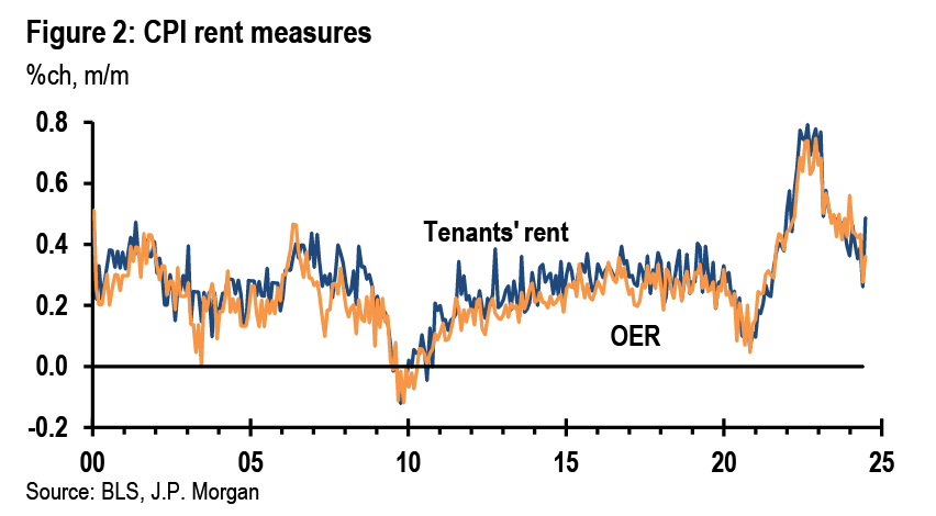 • Economics: Headline CPI rose 0.2% last month while the core index increased 0.165%, leaving the year-ago rate to moderate to 3.2%. Meanwhile total retail sales increased 1.0% m/m while the control series rose 0.3% last month. Initial claims declined to 227k and we expect filings to remain roughly constant at 230k at the next print