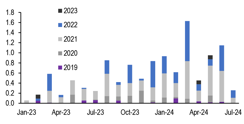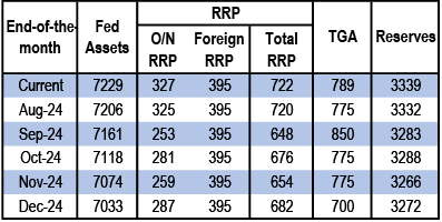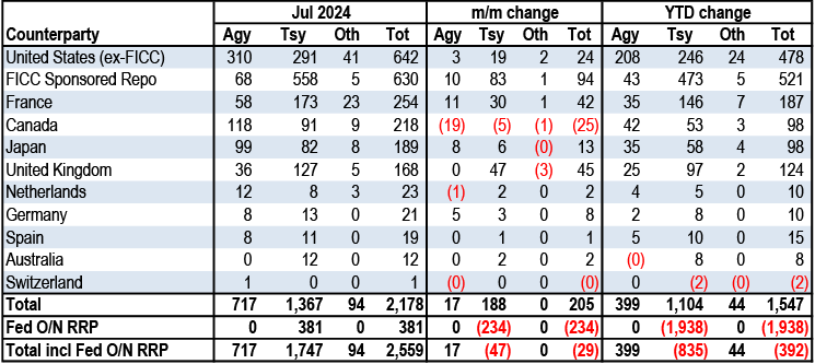 Turning to the Fed’s balance sheet, RRP balances have trended lower, reaching $330bn on 8/16, and fell as low as $287bn on 8/7, a level not seen since May 2021. Positive net T-bill issuance over the past couple of weeks has likely contributed to the lower facility balance, though we might be approaching some sort of floor as the uptick in net T-bill issuance stalls in early-September. Furthermore, MMFs maintain some amount of exposure to the Fed’s ON RRP to help meet their liquidity needs that cannot be entirely met with repo or T-bills alone. For the remainder of the month, we expect RRP balances to hover in the low to mid-$300bn range (see Short-term fixed income).