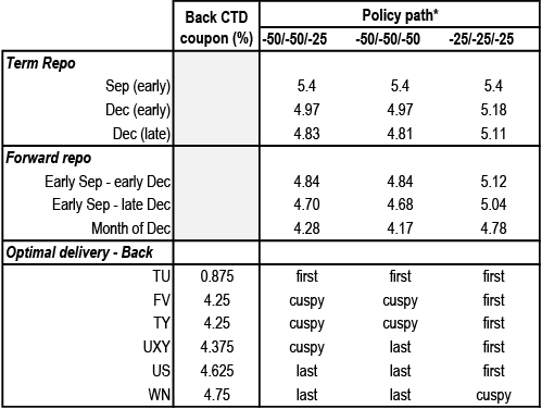 2-year SOFR swap spread (bp) -18 -6 Policy uncertainty is back, and with it jump risk - stay bullish on short expiry volatility despite apparently rich valuations. Maintain front end swap spread wideners, and add exposure to narrower 10Y swap spreads and a flatter 3s/7s swap spread curve. Position for a flattening of the TU inter-CTD swap spread curve. An analysis of 3M expiry implieds suggests that election premia being priced currently are lower than in May, and in a smaller post-election time window.