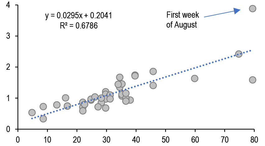 Treasury yields and corporate spreads have largely retraced their post-payrolls move, supported by the relative strength of the data and normalization in risk sentiment. Next week we look for initial claims to remain rangebound and we think Chair Powell will provide little clarity at next week’s Jackson Hole symposium. RRP balances have declined to around $300bn and amid the tightening in liquidity conditions, we think QT has a few more months left.