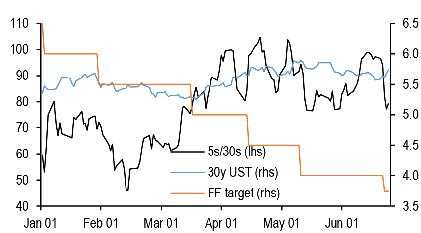 • US: If our above-consensus unemployment rate forecast come to fruition, this should bias Treasury yields lower in the near-term. We recommend expressing this bullish view with curve steepeners: curves look less steep when we also adjust for the market’s medium-term inflation expectations and the Fed’s share of the Treasury market: initiate 3s/20s steepeners. We discuss historical bear steepening periods over the last 35 years, particularly other instances when these moves took place alongside Fed easing: overall, the curve tends to consolidate after a brief bout of steepening, and long-end yields tend to stabilize or move lower as the Fed eases further. We review the tenth annual Treasury market conference, focusing on the panel discussions. T-bill supply is about to turn positive and we see $270bn of net issuance in the Oct-Nov period. Front-end bills are in the richer quartiles of their recent ranges, and the combinations of positive supply and quarter-end dynamics support some cheapening in the near term; risks are more balanced further out the T-bill curve. Stay neutral TIPS but hold energy-hedged 5s/10s BE curve steepeners. A strike among ILA dockworkers appears likely which could disrupt supply chains and push up CPI inflation around the end of the year. The bear steepening of the curve in recent weeks is partly explained by moves in long term inflation expectations, which is also helping to spur second-principal component volatility higher - underweight volatility on 10-year tails versus 30-year tails, overweight 2-year tail volatility versus 5-year tails, and overweight 5s/30s YCSO volatility versus swaptions. Stay neutral on swap spreads outright, but initiate exposure to a steeper 7s/10s maturity matched swap spread curve. Turn tactically neutral on volatility on an outright basis ahead of next week’s data.