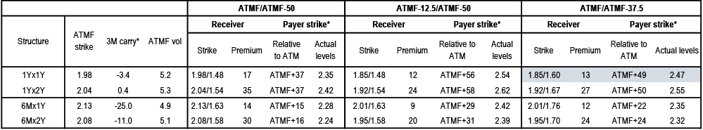 • Euro: Maintain bullish duration bias on risks of markets overshooting/pricing higher recession risks. Stay OW intra-EMU/€-SSA via OW 10Y Spain vs. Germany, OW 10Y EU vs. swap and OW 5-7Y KfW vs. Germany. Enter 5s/10s France steepener vs. Germany. Take profit on 10s/30s Italy flattener vs. Germany and long 5Y Italy CDS cash basis. Take profit and re-strike 1Yx1Y receiver spread versus OTM payer to enter at a net credit reflecting our increasing conviction of a limited back up in reds. Take profit in 2s/5s conditional bull steepener. Take profit and re-strike 2s/5s/10s conditional bull-belly cheapener via 3M receivers. Hold 10s/30s swap curve tactical flatteners hedged versus longs in reds (16% risk) on RV considerations. Keep Dec24 Schatz €STR swap spread widener as convex risk-off hedge to our long carry portfolio. Expect directionality to intra-EMU spreads to increase in a flight to quality/risk-off move potentially driven by macro or geopolitical concerns. Neutral on Bund swap spread. Initiate Dec24 Schatz/Bund €STR swap spread curve flattener. Sell 3Mx30Y gamma with infrequent delta hedging; stay short 6Mx10Y unhedged straddles.