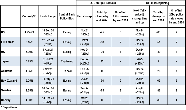 Summary of current policy rates, J.P. Morgan forecast for next policy rate change and current market pricing in OIS over the next 36 months across DM central banks