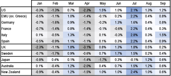 As the end of the quarter is approaching, we refresh our analysis of bond returns. We had already highlighted that the month of July delivered particularly strong returns for bond investors and we now note that, even though the pace of gains moderated, also August and September continued to positive bond performance. Therefore, despite the disappointing DM bond returns during the first part of the year, 3Q delivered a strong performance to rates investors, with July being the month with the highest YTD returns ( Figure 6). Overall, the positive 3Q returns outpaced the losses accumulated during 1H24 with larger 3Q returns than total YTD returns across all DM jurisdictions except Sweden and New Zealand ( Figure 7). The highest YTD bond returns were delivered in New Zealand (4.4%), Italy (4.2%) and US (3.9%), while in Japan (-1.5%), France (-0.7%), and UK (-0.2%) bond returns so far this year remain negative. From now until the end of the year, we still expect decent strong positive bond returns across DMs around 1-3% across most countries ( Figure 8). The highest returns over 4Q are expected in the UK (4.5%), while the lowest will be in Italy (-0.8%) and Australia (0%).