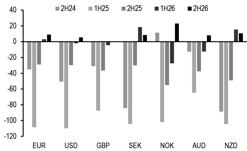Figure 4: OIS markets are expecting that most central banks will have eased rates between 200bp and 250bp by the end of 2026 with a more aggressive expected pace of easing next year, especially from the Fed, and the cutting cycle likely to be concluded in 2H25 across most jurisdictions