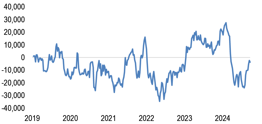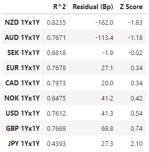 • Australia & New Zealand: Stay paid AUD 1s/2s IRS curve, and received AUD 5Yx5Y vs. US. Stay paid the Nov ’24/Feb ’25 RBNZ OIS spread ACGB Apr-2026s on ASW.