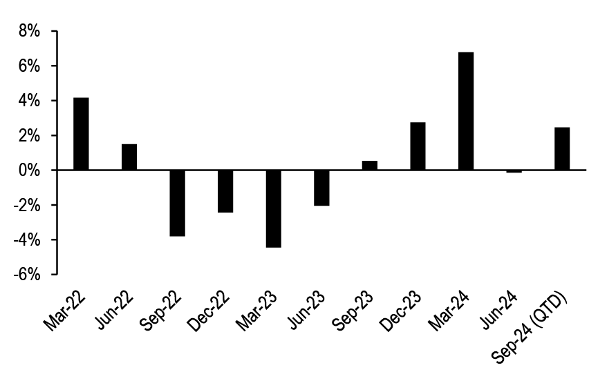 Turning to central banks, this week the RBA left policy rates on hold at 4.35% with the overall delivery being perceived by markets as less hawkish relative to previous meetings given the absence of a discussion on rate hikes. The board seemed to indicate that they are not yet confident on inflation but they appeared less dismissive on rate cuts. Our economists continue to call for a start of easing in February 2025 given our expectation that inflation would annualize within the target band in 2H24; however, there are risks of an earlier cut if inflation slows at a faster than expected pace. On Wednesday, the Riksbank cut rates by 25bp in the morning to 3.25% and signaled rates would likely cut at the two remaining meetings of the year. The Riksbank communication was broadly dovish as they highlighted the possibility of a 50bp cut, even though this was not evident from the official rate path which showed 100% probability of two 25bp cuts in 2024. Finally, this week also the SNB cut the policy rate another 25bp, down to 1%.