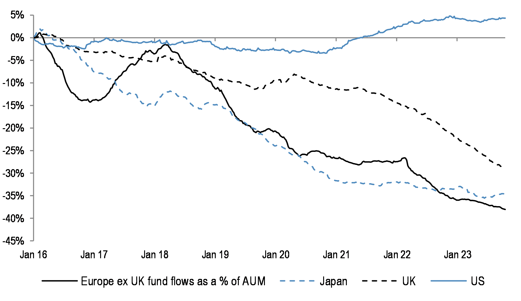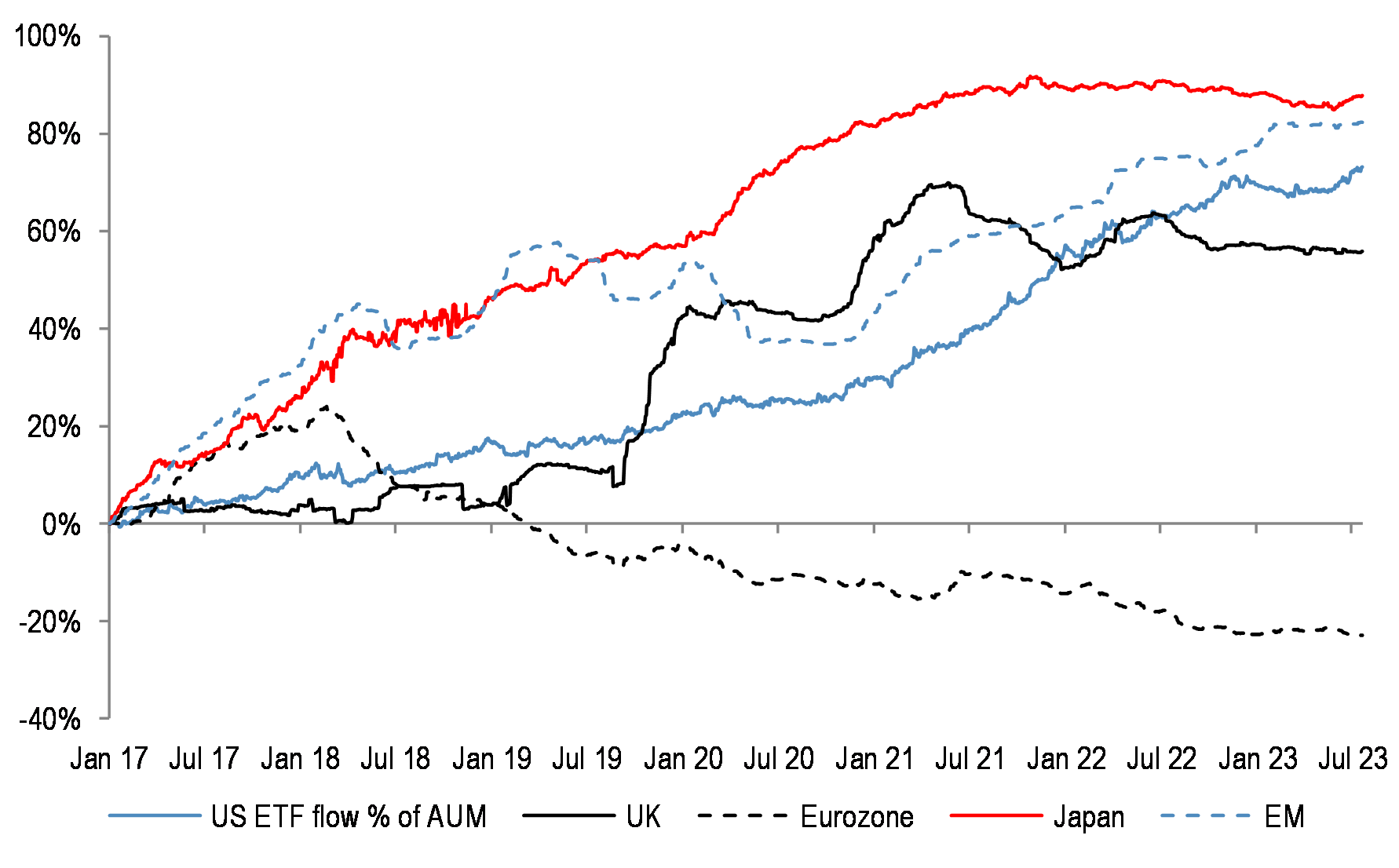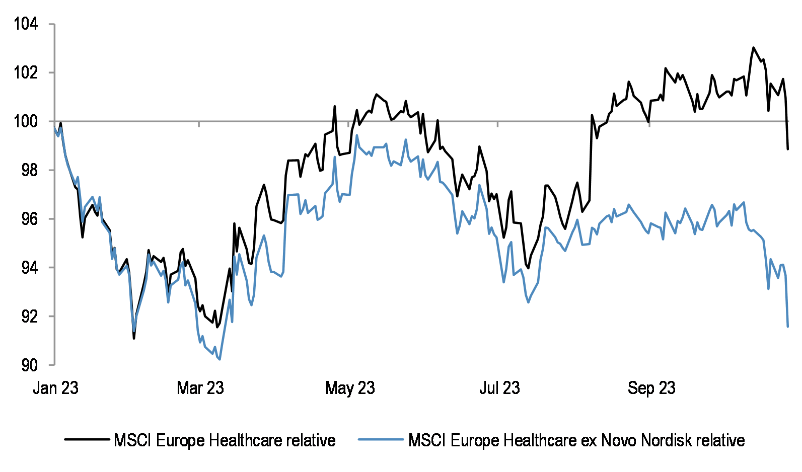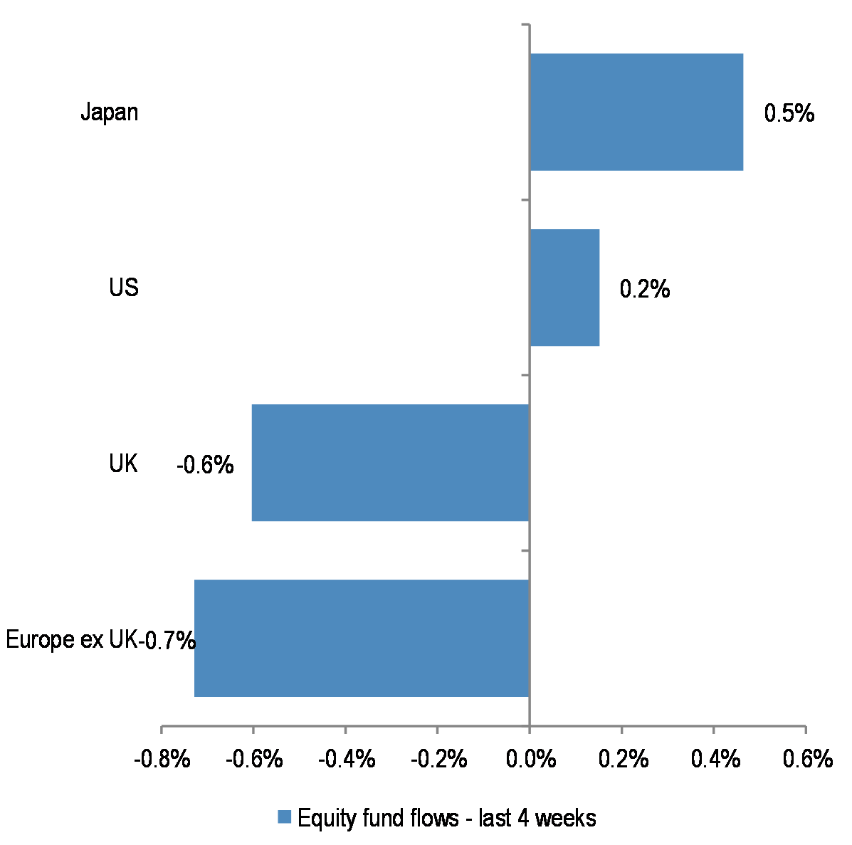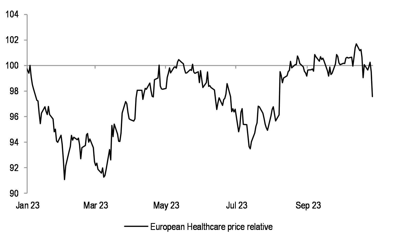 • Finally, Banks remain much more levered than any other sector, and are a beta play on overall activity. Banks could suffer if economies enter contraction, and if some of the very benign credit backdrop changes next year, with spreads widening and delinquencies rising. Regionally, we maintain our preference for Japanese over US and European banks. We are using the funds to upgrade Healthcare, from Neutral to OW. The sector has lagged this year, but could benefit from high USD exposure, low beta and the long duration angle.