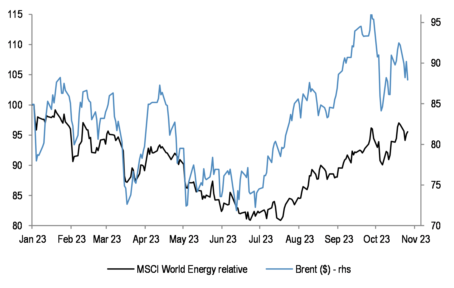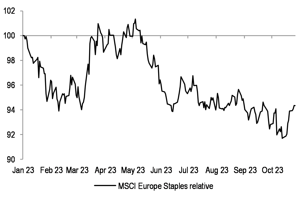 The group traditionally displays the most positive correlation to bond yields. If bond yields peak out, or if ECB cuts rates next year, Banks stocks’ profitability is likely to weaken.