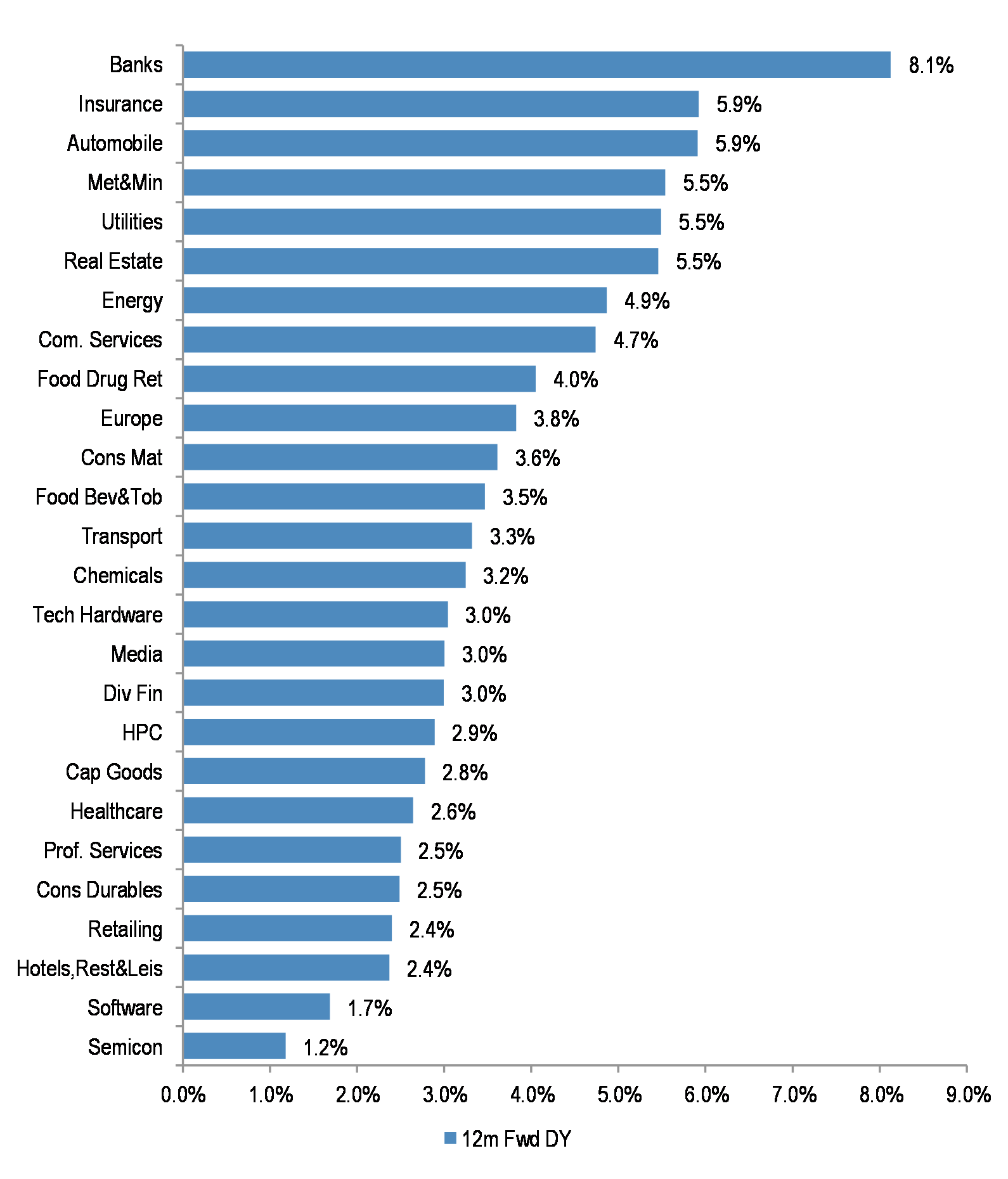 Total return yield for Banks stocks is the highest among all sectors, with both dividend yield and buybacks yield relatively elevated. However, dividends and buybacks are unlikely to be safe if the credit or macro environment weakens, or if the regulatory scrutiny increases.