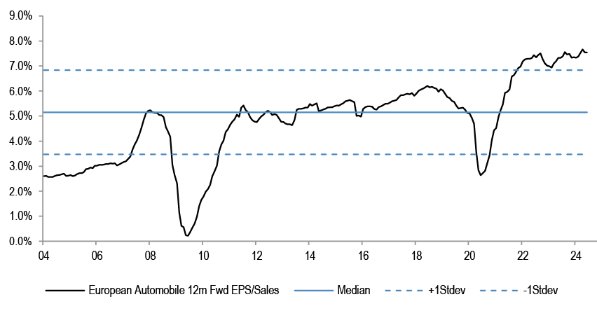 EBIT margins for the sector are still elevated in a historical context, and will be under pressure from a rollover in pricing and more Chinese competition. Inventory levels have normalized.