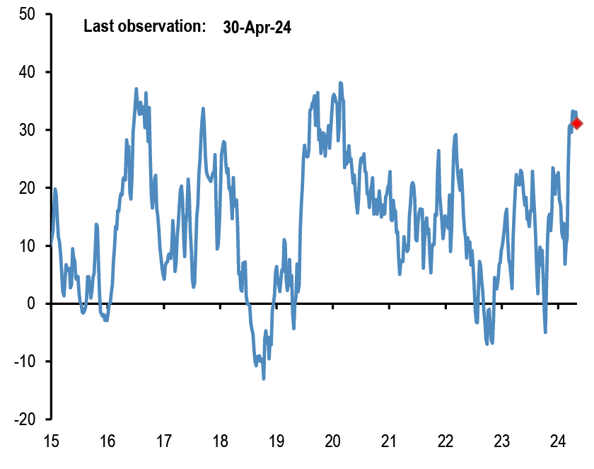 • After the release this week of the Fed’s senior loan officer survey, along with the ECB’s bank lending survey that was released a few weeks ago, financial conditions have again featured in our conversations. After the significant decline in respondents reporting a tightening in lending standards in both the US and the Euro area in the 1Q24 surveys, the latest survey suggested a modest tightening for the US in 2Q and a continued modest decline to close to zero for the euro area.