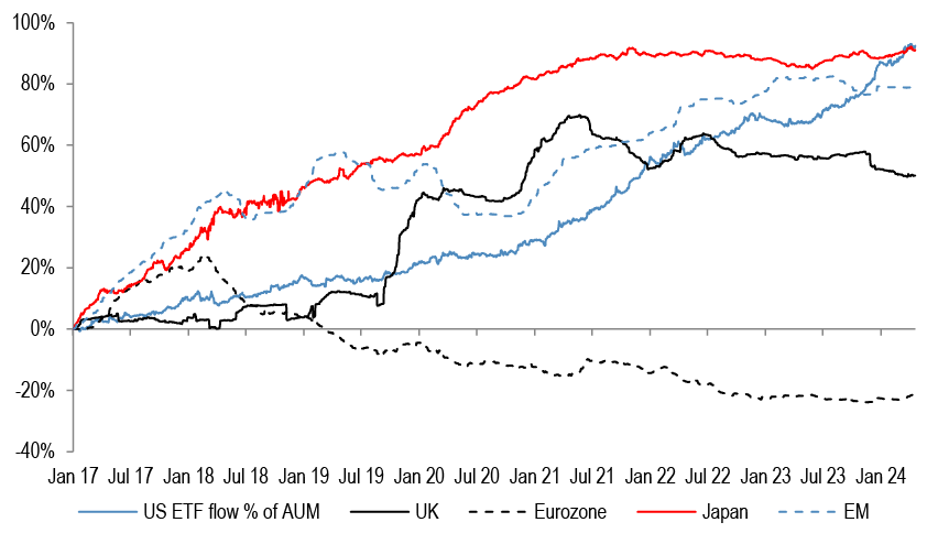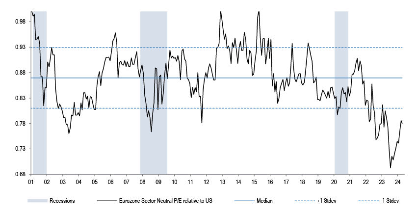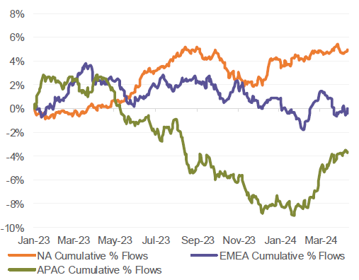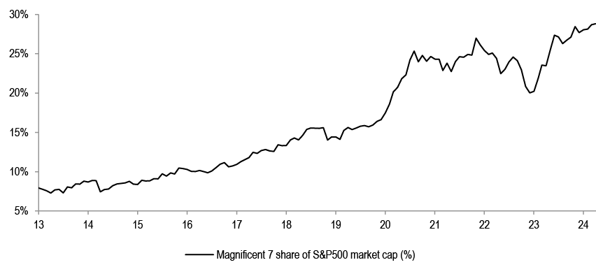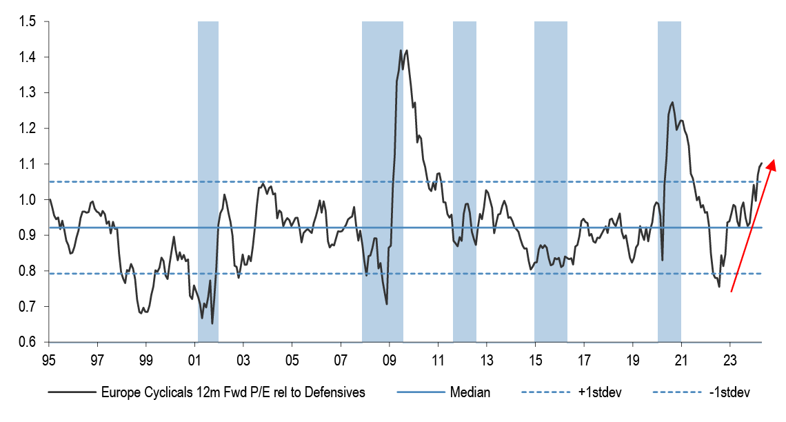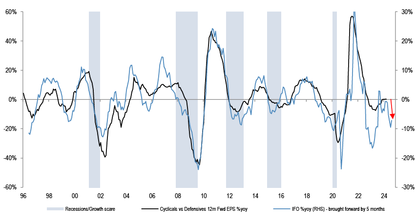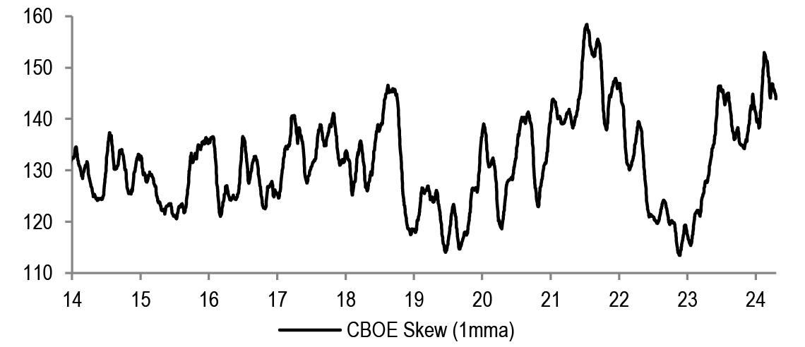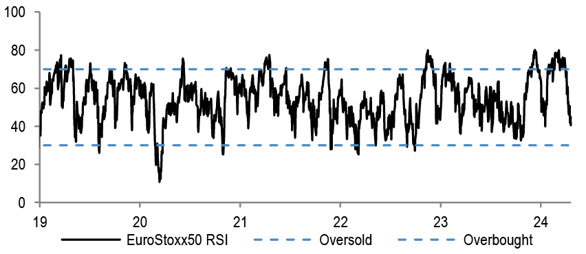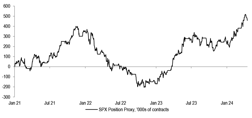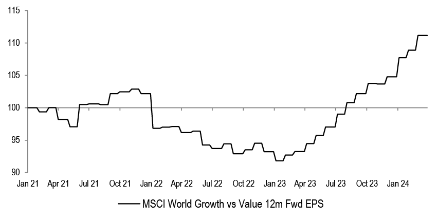 We do not think that P/Es can drive further equity upside without the support of earnings upgrades. Investors are expecting S&P500 EPS to accelerate by almost 20% by Q4 compared to the projected Q1 ‘24 levels. That hurdle rate is too steep in our opinion.