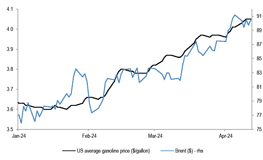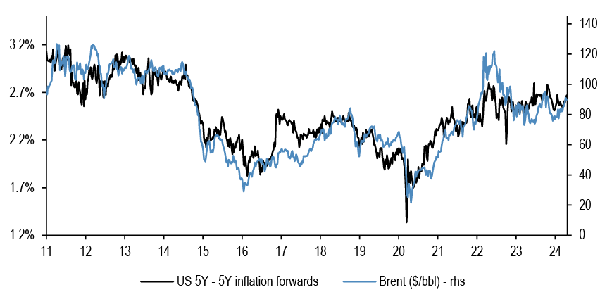 Brent and inflation forwards exhibit a strong positive correlation. Inflation could remain sticky at or above current levels unless oil prices move lower.