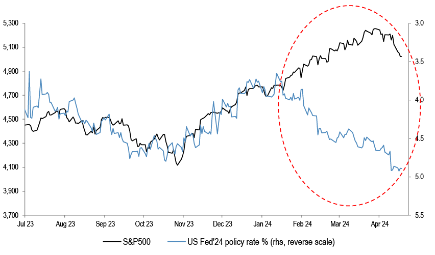 • This is in addition to Fed futures vs equities gap that we have been highlighting in past weeks. Last October, when S&P500 was at 4200, Fed was priced to cut rates 70-80bp this year. At the point of peak dovishness in January, this moved to as much as 180bp of cuts for 2024. Today’s market pricing of only 40bp of cuts is below the starting point of last October. Our view remains that bond yields going higher from current levels will not be taken well by the equity market, similar to what transpired last summer when S&P500 had a 10% drawdown. The P/Es vs real yields gap is already meaningful - middle chart.