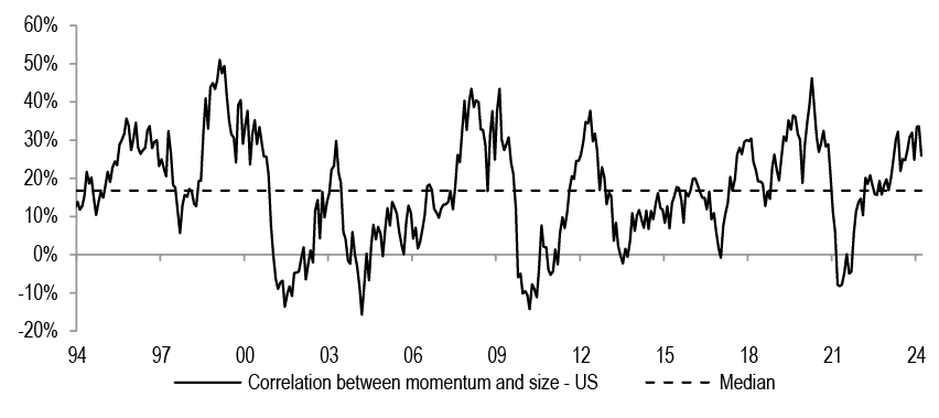 The correlation between momentum and size factors is at elevated levels, suggesting that stocks with bigger index weights are driving the momentum rally.