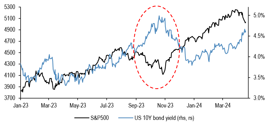 Our view is that a continued move higher in yields will be problematic for equities. Last year, when yields moved from 3.9% to 5%, S&P500 had a 10% drawdown.