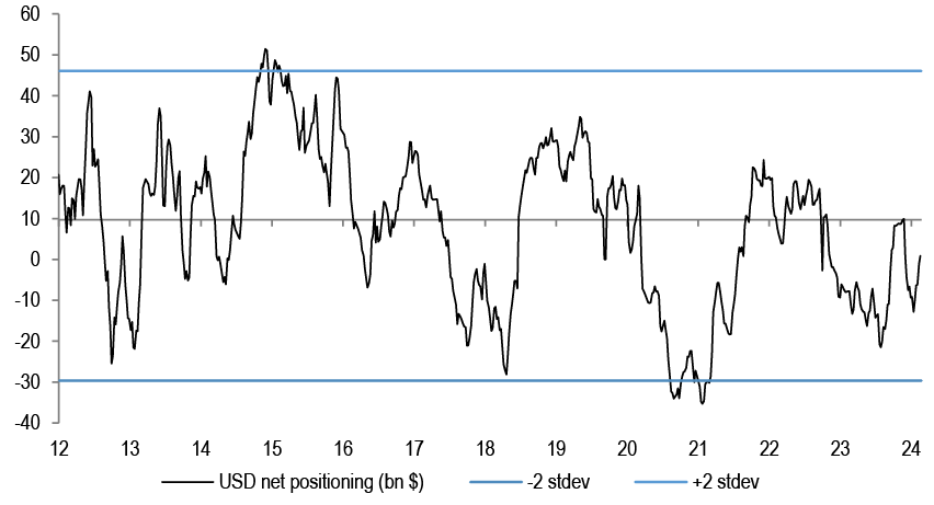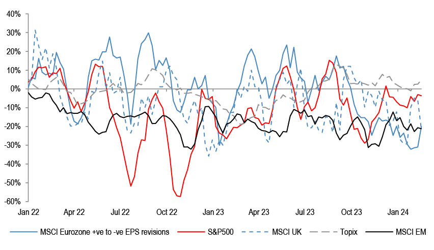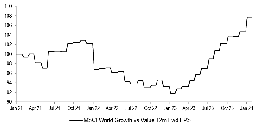 • Putting the above 3 together, one might end up with a disappointing profits outcome even without seeing an outright recession, and we note that 2024 EPS projections keep coming down in key regions. Now, could S&P500 earnings do much better than economy wide profits? It is interesting to note that for S&P500 all the profit growth in the past few quarters was due to Magnificent 7, and this is one of the reasons why we remain OW Growth vs Value.  Ex these stocks, EPS growth for the remaining S&P500 constituents is outright negative. USD plays a role here, and if it gets stronger, as we suspect, then the S&P500 earnings might not outperform NIPA much.