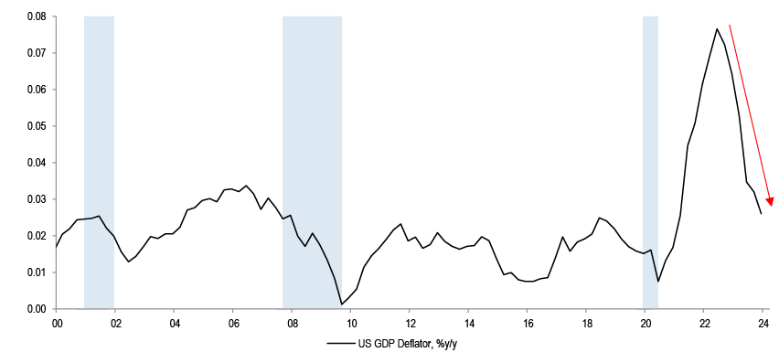 • 3. US economic activity was much more robust last year than most assumed, and this has potentially boosted productivity and in turn reduced ULCs. If the economy slows, partly because the supports that it enjoyed last year do not repeat, such as fiscal stimulus, ULCs could pick up. Profit margin proxy, corporate deflator minus ULCs, could turn into more of a headwind.