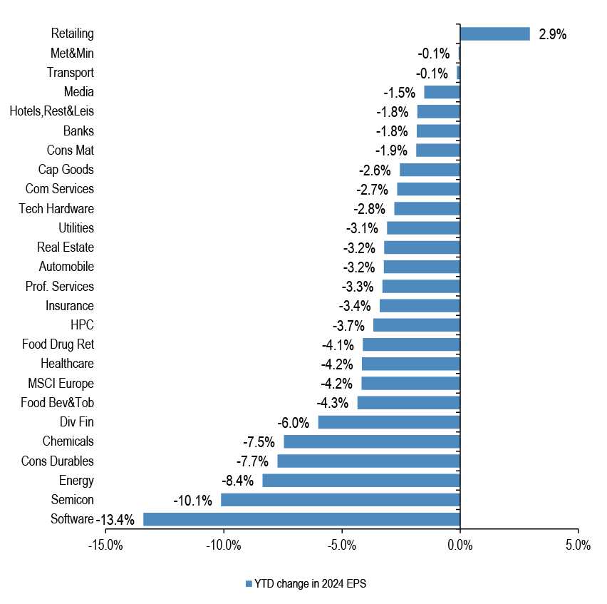 • 1. Many corporates benefitted from the unique feature of this cycle: as interest rates increased 300bp+, the net interest expense came down. That could be explained by companies locking in low cost of financing through extending the duration of their debt, and also through many corporates seeing an improving return on their cash balances. This, rather counter-intuitive, development is set to normalize as time passes. Companies will have to roll their debt into higher cost of credit. Separately, the basket of stocks with high refinancing needs is losing 20% vs SXXP over a year ago - JPDEHFCL, and our basket of cash rich companies is ahead by 14% - JPDEHFCW. We think this outperformance will continue through 1H.