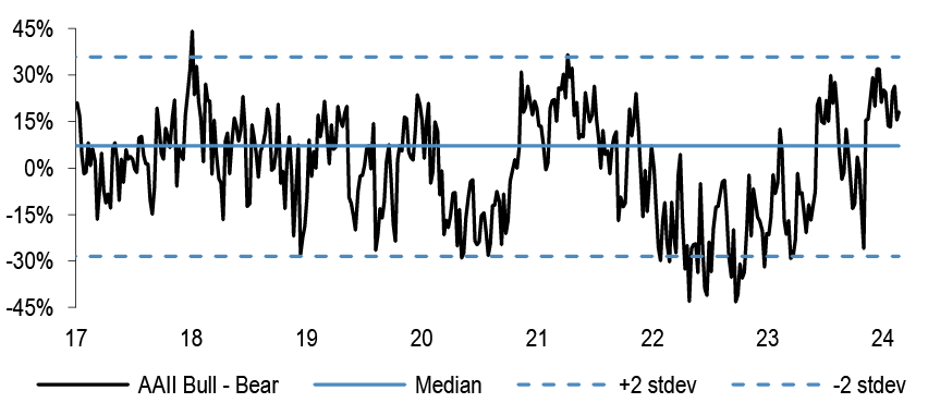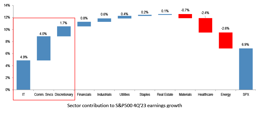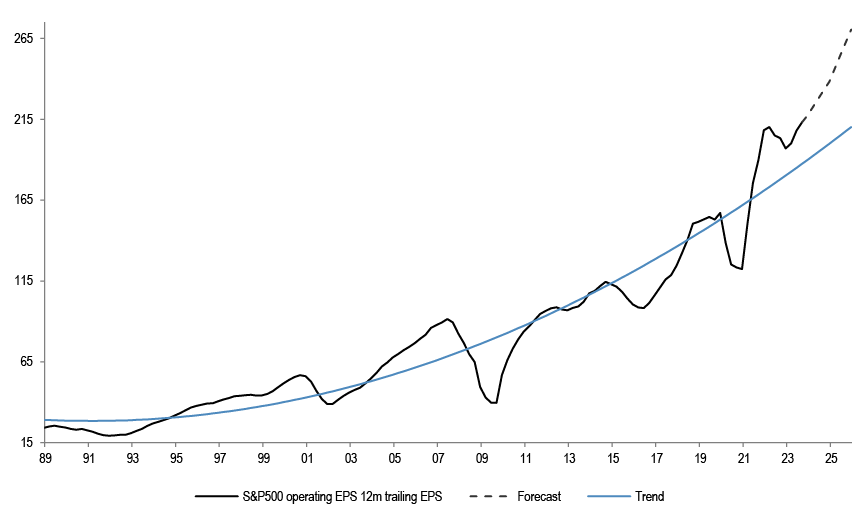 Consensus projections are for S&P500 EPS growth to accelerate in 2024 and 2025, to 10-11% pace, from 2% seen in 2023. Bulls are basing their constructive market call on this, but the question is whether earnings and margins will continue to grow from what is an already elevated starting point?