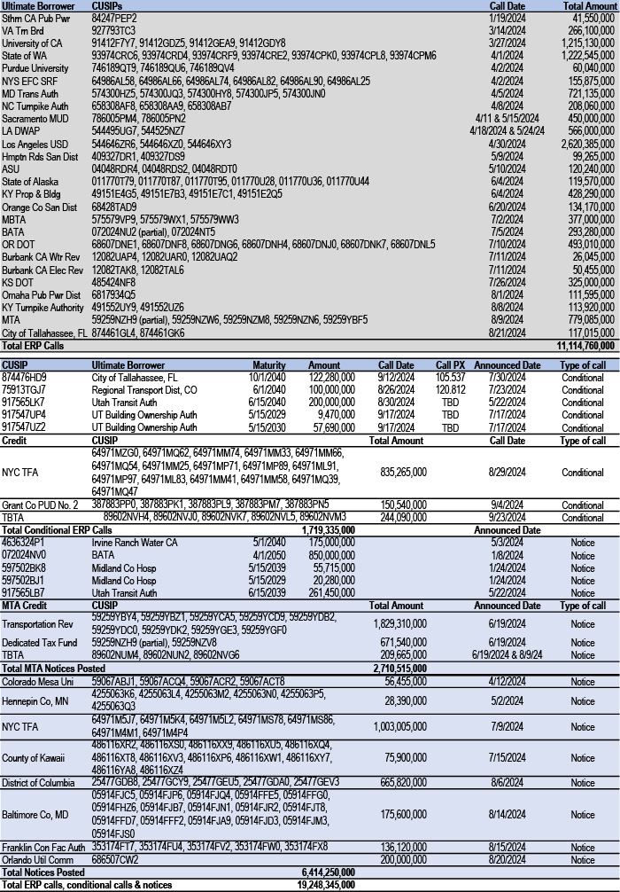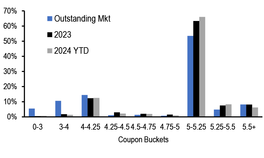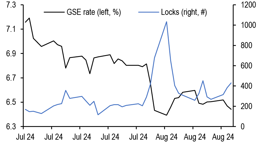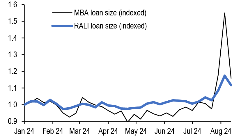 Mortgage rates are roughly unchanged across the stack, with lower coupons modestly tighter. Along with most spread products, valuations have recovered from the local wides seen early in the month; still, with mortgages continuing to offer historically compelling yields vs. corporates, we think the technical support for the product from money managers can be maintained. We continue to prefer UIC conventionals and are underweight 4.5s and 5s. Primary rates have fallen to roughly 6.44% on GSE loans and 5.47% for VA IRRRLs, but we have not seen a surge in refi applications, likely as originators picked up some low hanging fruit earlier this month ( Figure 4, see Mortgages). Mortgage credit spreads similarly retraced much of the widening seen earlier in the month with AAA non-QM back to 130bp in new issue. We expect spreads to remain rangebound over the rest of the year as the macro outlook remains challenging while the election season quickly approaches. Primary activity has been very active this summer, but stepped down over the month from $12bn to $7bn new issue RMBS in August, and we think primary markets will be light in the next week (see RMBS).