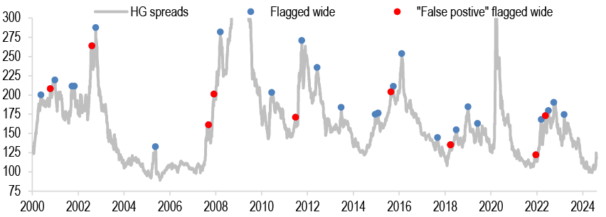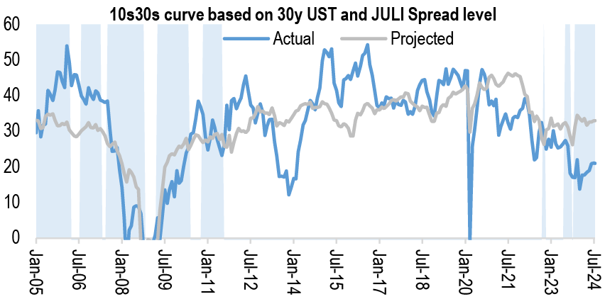 As we look ahead, we continue to forecast 50bp cuts at the September and November meetings followed by 25bp per meeting thereafter. Our forecast is rooted in both the resumption of the disinflationary process which remains broad based across components, together with ongoing loosening in labor markets, which has reduced the risk prices remain sticky. With the beginning of the easing cycle less than a month away and OIS forwards pricing in 103bp of easing through YE24 compared to our own projection of 125bp, this would indicate there is value to being long duration. However we remain patient as growth data has turned more favorable in recent weeks and we do not think the debate surrounding the pace of easing will be settled before the August employment report. Moreover valuations look close to our fair value estimate, and in an environment in which term premium is biased higher, we think it’s unlikely that valuations overshoot to the rich side of fair value. Thus, we remain neutral on duration but continue to favor 5s/30s steepeners as a medium-term expression of our bullish view (see Treasuries).