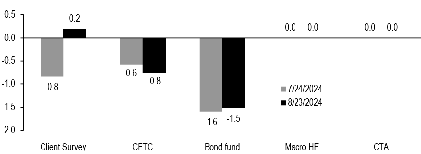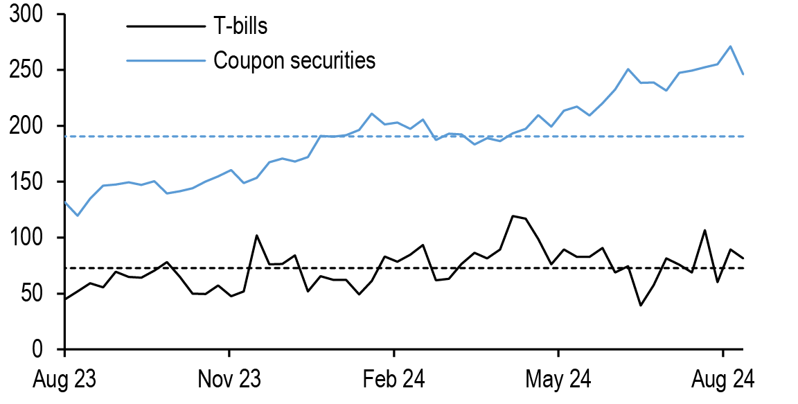 Chair Powell’s dovish tone supports our forecast of consecutive 50bp cuts at each of the next two meetings, but the August employment report is still two weeks away, valuations are no longer cheap, and dealer positioning is elevated, so we stay neutral duration for now. Powell’s comments support further long end steepening, and we recommend holding 5s/30s steepeners to express our core view. Most front-end curves appear too steep relative to their drivers, but 3s/7s offers value for those who want to position for a quicker and more aggressive easing cycle. We discuss the outlook for T-bill supply and valuations. Hold tactical 5y5y inflation swap longs.