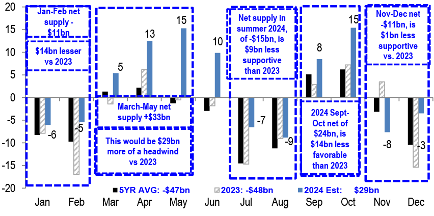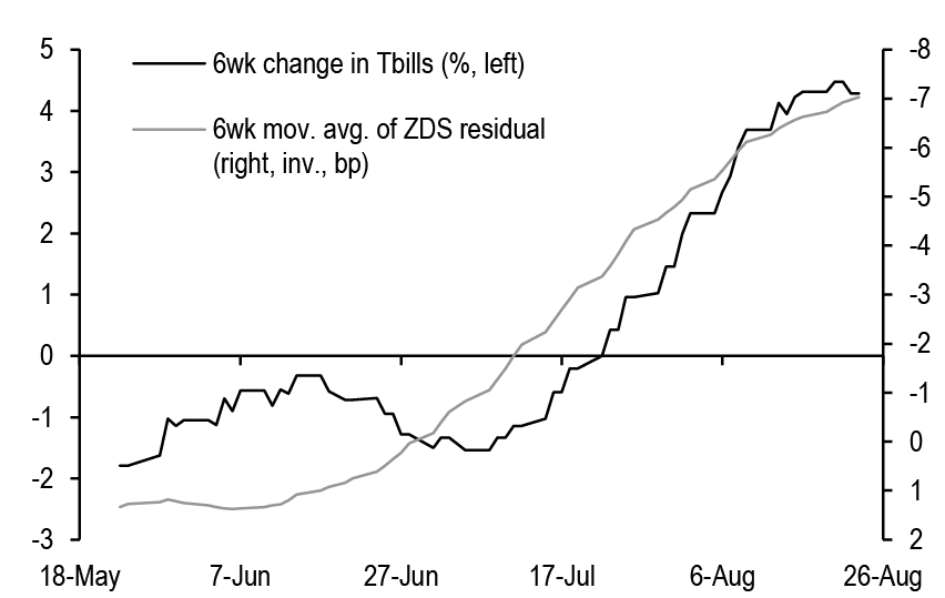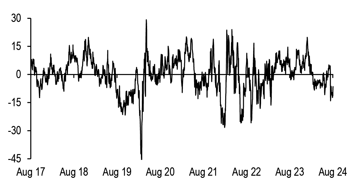 Turning to inflation markets, intermediate breakevens remain cheap to our fair value framework, though the model residual narrowed on Friday, given a dovish shift from Fed Chair Powell. In recent months, the Fed’s wavering confidence in disinflation and thus a heightened focus on labor market data created a less supportive backdrop for TIPS, with real yields demonstrating lower sensitivity to nominal yields in rallies than in sell-offs. However, we argue that the backdrop is becoming more supportive for TIPS once again. Along the curve, the intermediate sector continues to offer value, and forward-starting swaps avoid the negative carry associated with spot breakeven positions. With the fundamental backdrop turning more supportive and valuations still cheap, albeit somewhat less cheap than a week ago, we maintain tactical long exposure in 5Yx5Y inflation swaps (see TIPS).