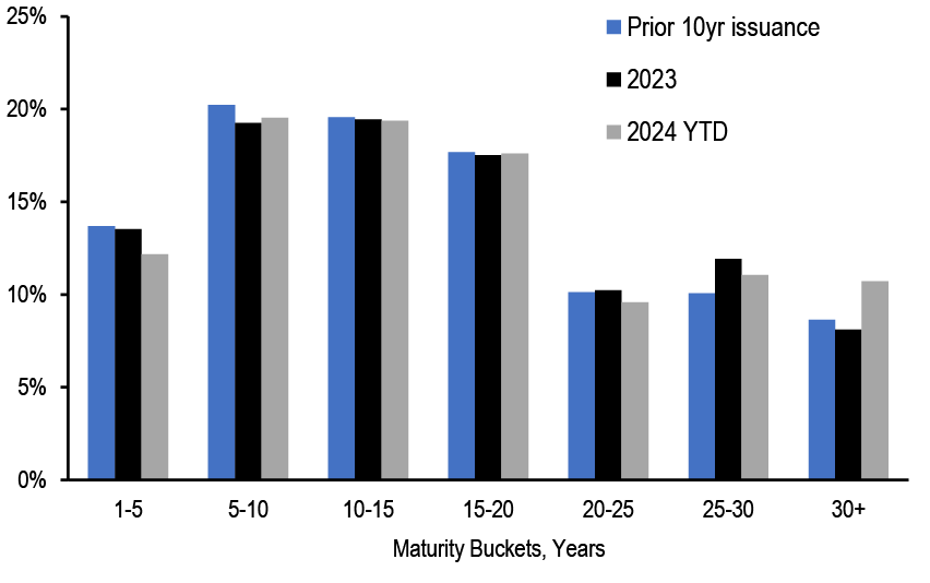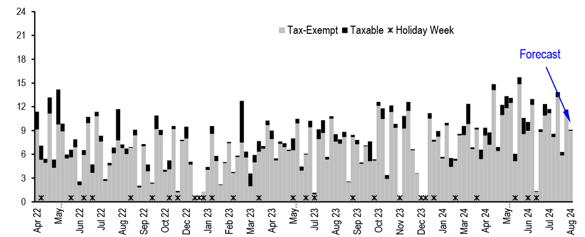 Treasury yields are lower and spreads stable as the economic data support a gradual economic cooling and as Fed communications confirm expectations of a near-term rate easing cycle. We continue to look for a 50bp cut at the next FOMC meeting and the August employment report will be key for determining the pace of easing. We modestly revise higher our HG gross issuance forecast to $1.5tn for 2024, leaving $400bn of issuance left this year.