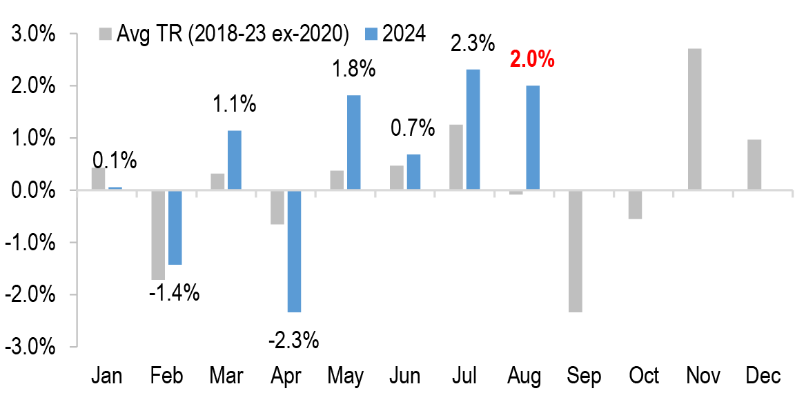• Corporates: HG bond spreads were stable last week despite declining yields. August on track to be the 4th consecutive month of positive returns, supporting demand. We revise up our FY24 supply forecast to $1.5tn leaving $400bn to go in 2024
