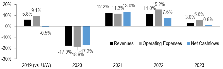 Issuance was similarly relatively light within CMBS markets over the past week. Benchmark CMBS spreads were slightly tighter, and valuations look fair relative to their corporate and mortgage comparables. Conduit IG mezz tightened more, with AS to single-As tighter 8-16bp over the week. We continue to see value in upper IG mezz bonds (AS and AA) which should be more insulated from near-term risks to the data but still look cheap relative to corporate comps and to the spread curve ( Figure 5). We also still see 5yr Agency CMBS as leaning cheap to current coupon Treasury OAS and ZVs. Our analysts review 2023 conduit CMBS property financial data, which indicates that net cashflow growth has slowed materially compared to recent years, with multifamily revenues in particular suffering from rising labor-related expenses and significantly rising insurance premiums (see CMBS).