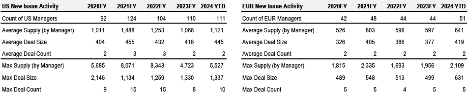 US CLO Primary AAA (Tier 1, bp) 135 SOFR + 150 We widened our base case CLO T1 AAA new issue spread forecast to 150bp (from 130bp prior) and introduced a 175-200bp risk case in the event of a hard landing.