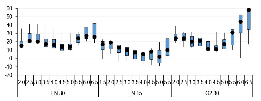 Despite the near certainty of a cut in September, the pace and extent of easing remain uncertain with OIS markets placing significant weight on both deep cut and shallow cut scenarios. In this period of elevated policy uncertainty, yields should remain highly sensitive to both new economic and policy information; Figure 2 shows the percentile moves in yields around Fedspeak events and indicates that markets are prone to greater sensitivity during periods of elevated policy uncertainty. Such a backdrop is conducive to jump risk and supportive of elevated realized volatility. Thus with significant jump risk going into August payrolls and beyond, we remain bullish on volatility in short expiries. We also remain positioned for a flattening in the swap spread curve. Front-end spreads should be biased wider as SOFR and GC rates normalize and net T-bill supply turns negative in September whereas long-end spreads should narrow against the backdrop of rising term premium. Therefore, we now recommend initiating exposure to a flatter 5s/30s swap spread curve (see Interest rate derivatives).