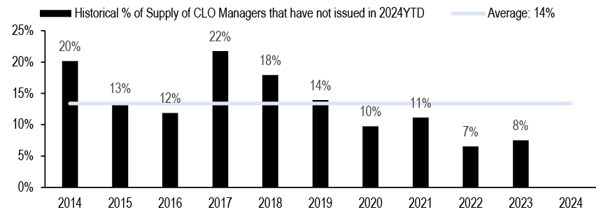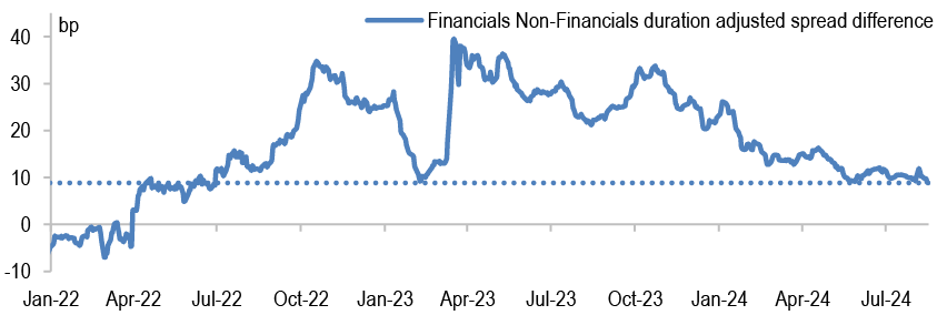 JULI spread to Treasuries (bp) 110 110 Still attractive yields, a continuation of positive returns, relatively lighter supply in the coming months and the start of Fed cuts will be supportive of spreads, while slower growth and a trend towards lower yields limits meaningful further spread tightening.